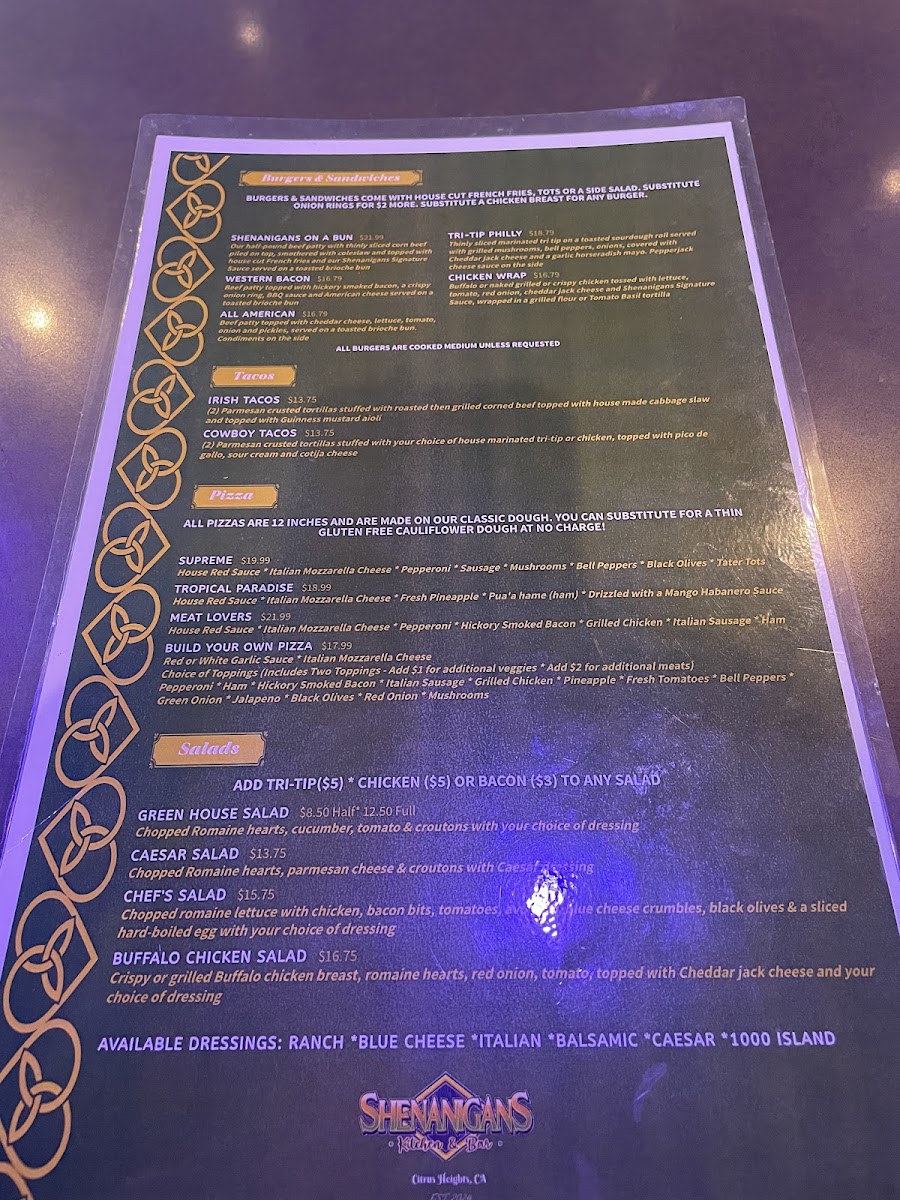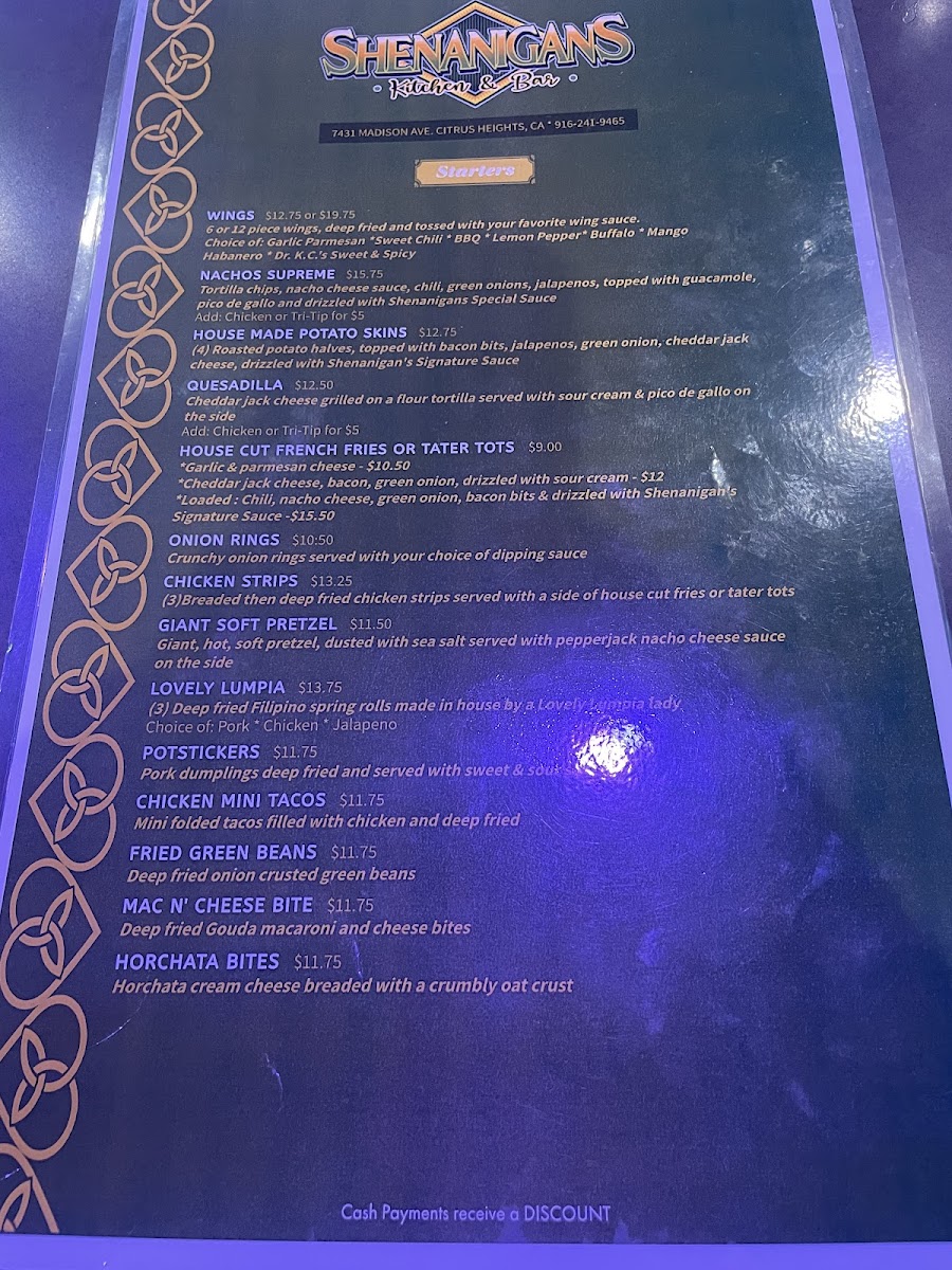 Welcome to Shenanigans Kitchen & Bar, a vibrant dining experience located in Citrus Heights, CA. This spot is not just about good food but also about creating lasting memories. The menu boasts an impressive selection that appeals to every palate.